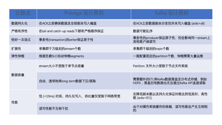为了详细解释这三点,我们可以先用下表来简单对比一下 Pravega 和 Kafka 设计哲学的不同之处,这也代表了流存储和消息队列的本质差异: