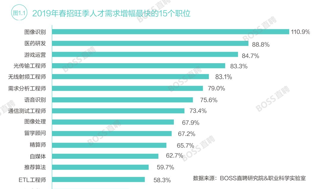 数据显示,2019年春招旺季人才需求增幅最高的15个职位中,人工智能类占据六席。