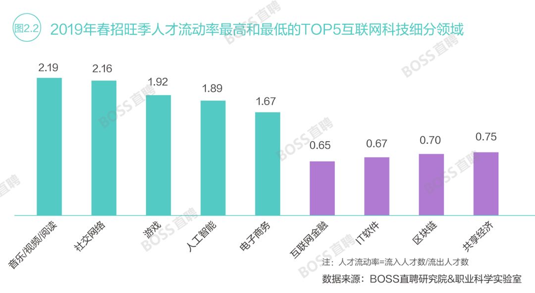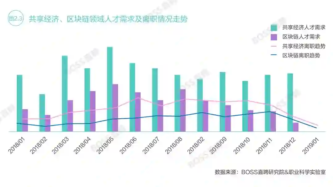 数据显示,2018年四季度,从共享经济和区块链领域离职的人数比上半年总和还要高出10个百分点。低迷的市场环境削弱了求职者的应聘积极性,导致行业人才从2018年的小幅净流入进入2019年初的大幅净流出阶段。