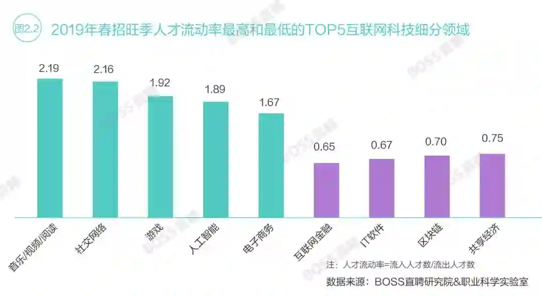 从互联网细分领域来看,2019年春招旺季,人才流动率最高的前三位分别为音乐/视频、社交网络及游戏,TOP3领域中,泛娱乐行业占据两席。