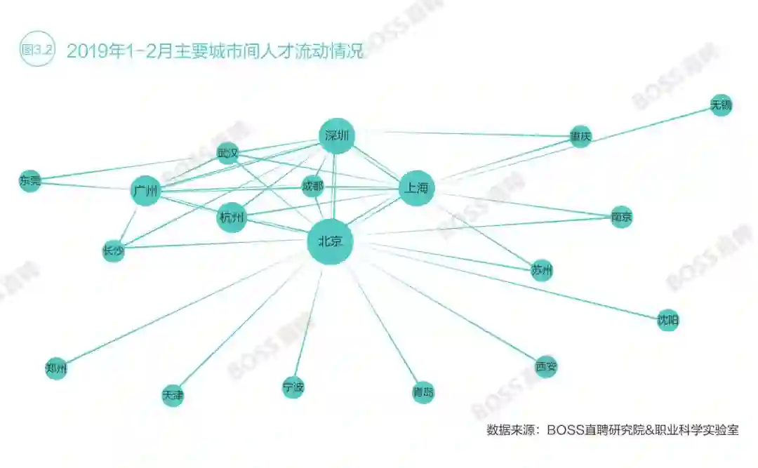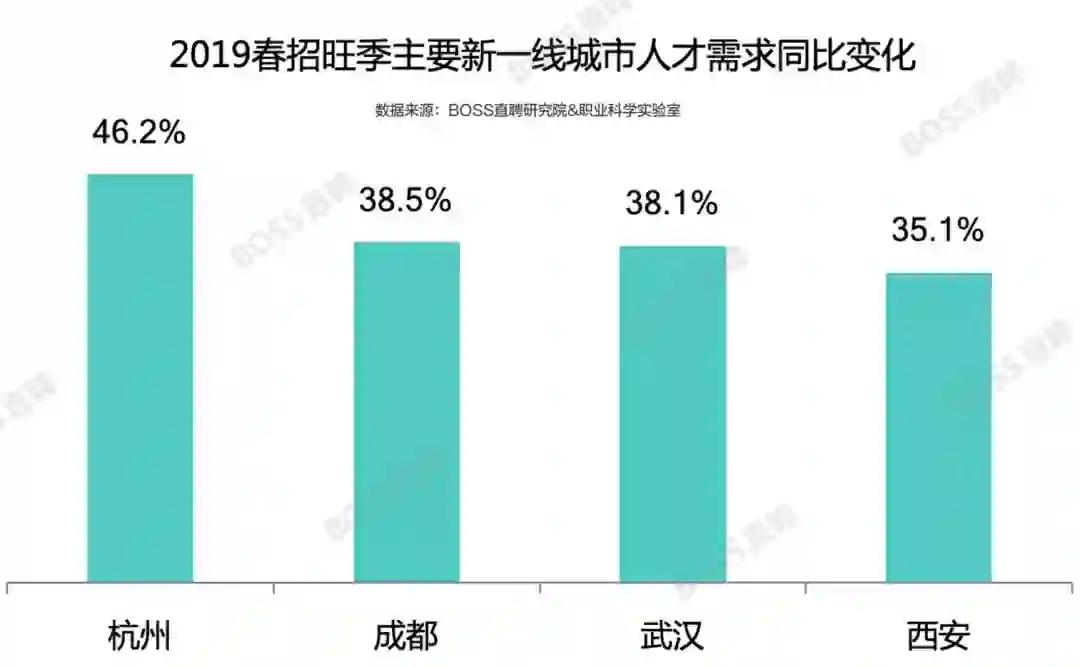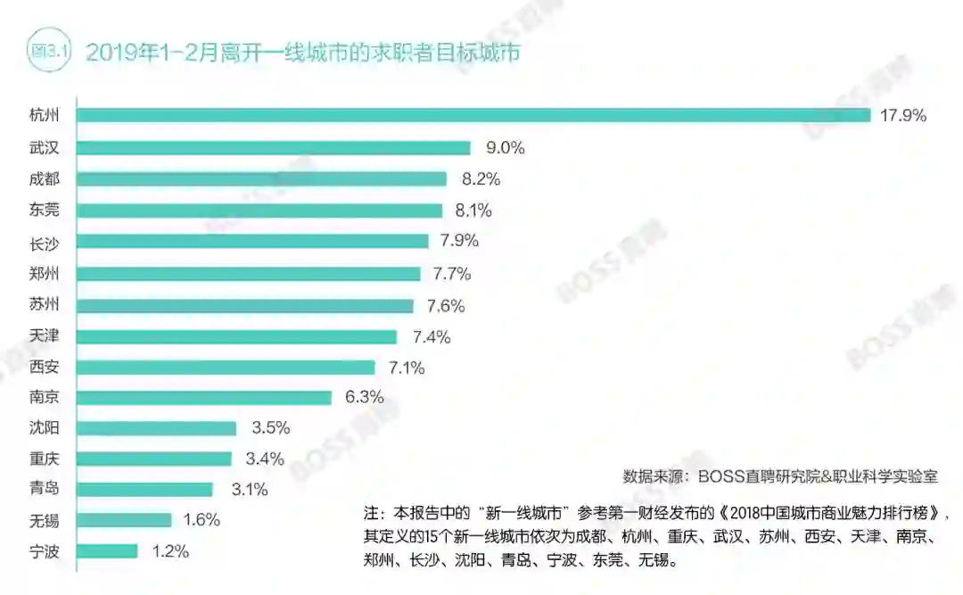 相应地,2019年1-2月,杭州、武汉、成都成为求职者离开一线城市后首选的前三个城市,稳坐新一线城市人才争夺战三甲。