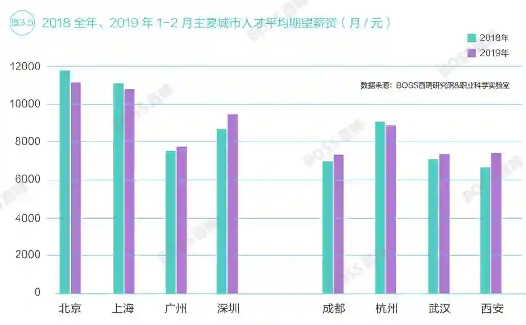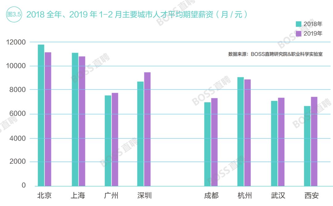 薪资福利也是求职者选择目标城市的重要考量因素。数据显示,2019年1-2月,一线城市求职者平均期望月薪为9794元。以杭州、成都、武汉、西安为代表的新一线城市,平均期望月薪达到7799元,较2018年上涨5个百分点。
