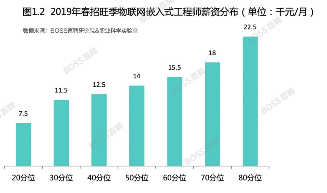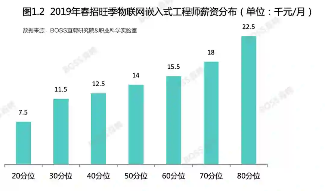 工信部数据显示,2016年,我国物联网市场规模已超过9000亿元,预计到2020年产业规模将会超过1.5万亿元。数据显示,2019年春招旺季,嵌入式工程师人才需求同比增速超过46%,由于人才紧缺程度高于其他技术职位,嵌入式工程师平均招聘薪酬达到18132元。