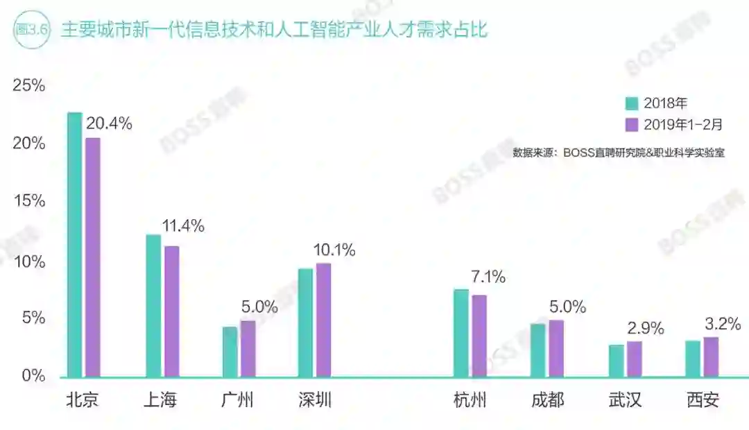 数据显示,2019年初,北京新一代信息技术和人工智能人才需求占城市人才需求的比例高达20%,位居全国首位,上海紧随其后。