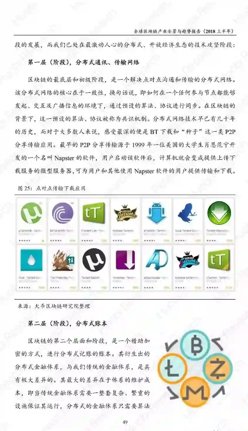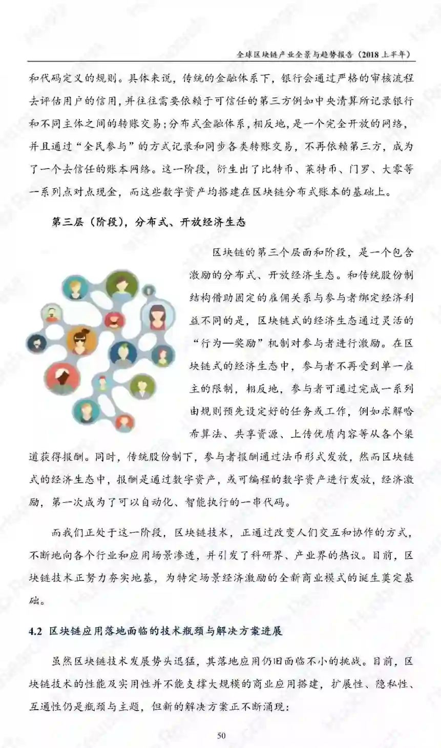 《报告》认为,区块链将经历三个层次和阶段的发展:第一是层分布式通讯、传输网络;第二层是分布式账本;第三层是分布式、开放经济生态。目前,区块链发展正处于第三阶段的技术攻坚阶段。