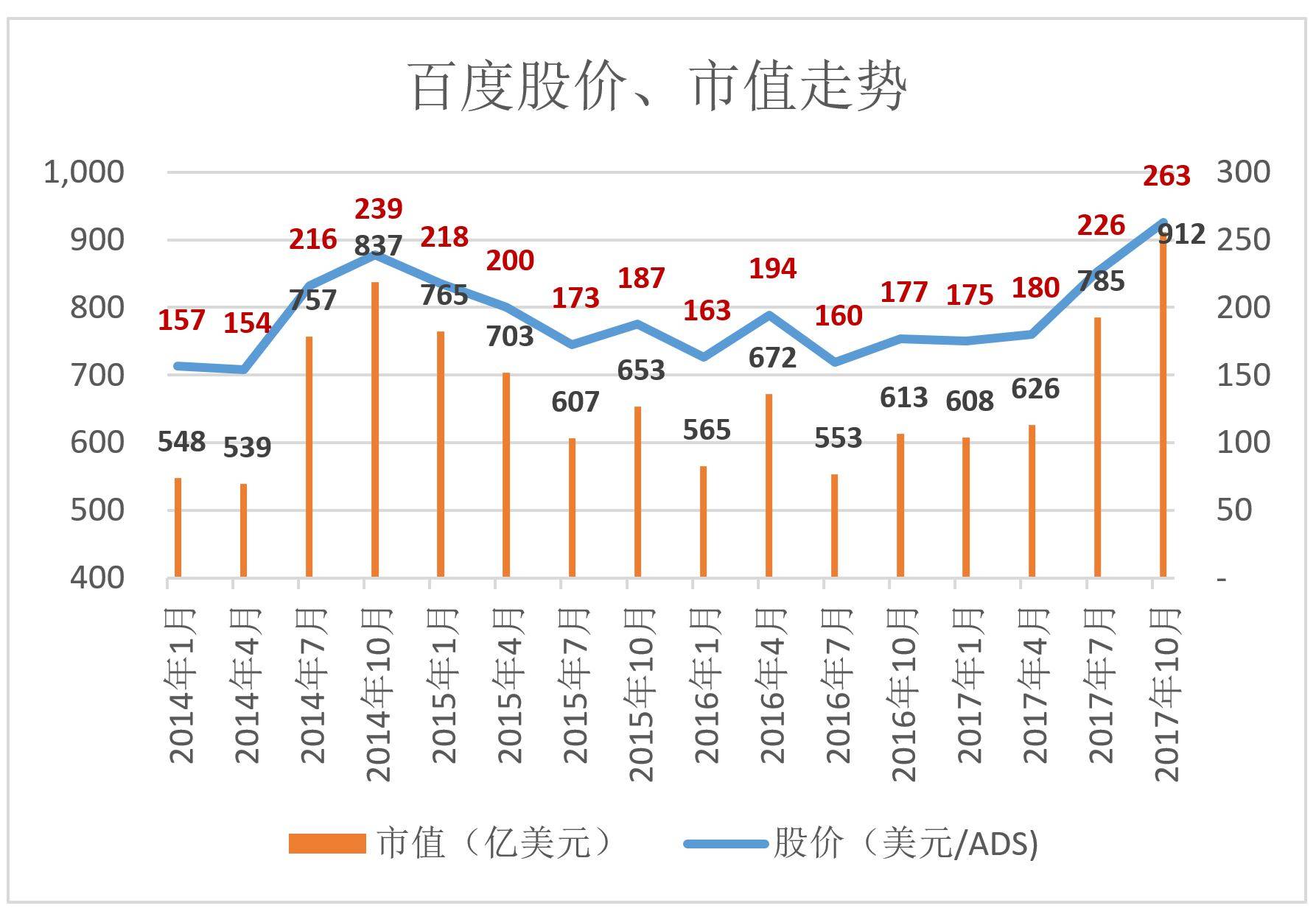 2017年7月开始,百度股价迅速回升并创出新高。按10月25日收盘价计算,百度市值为912亿美元。