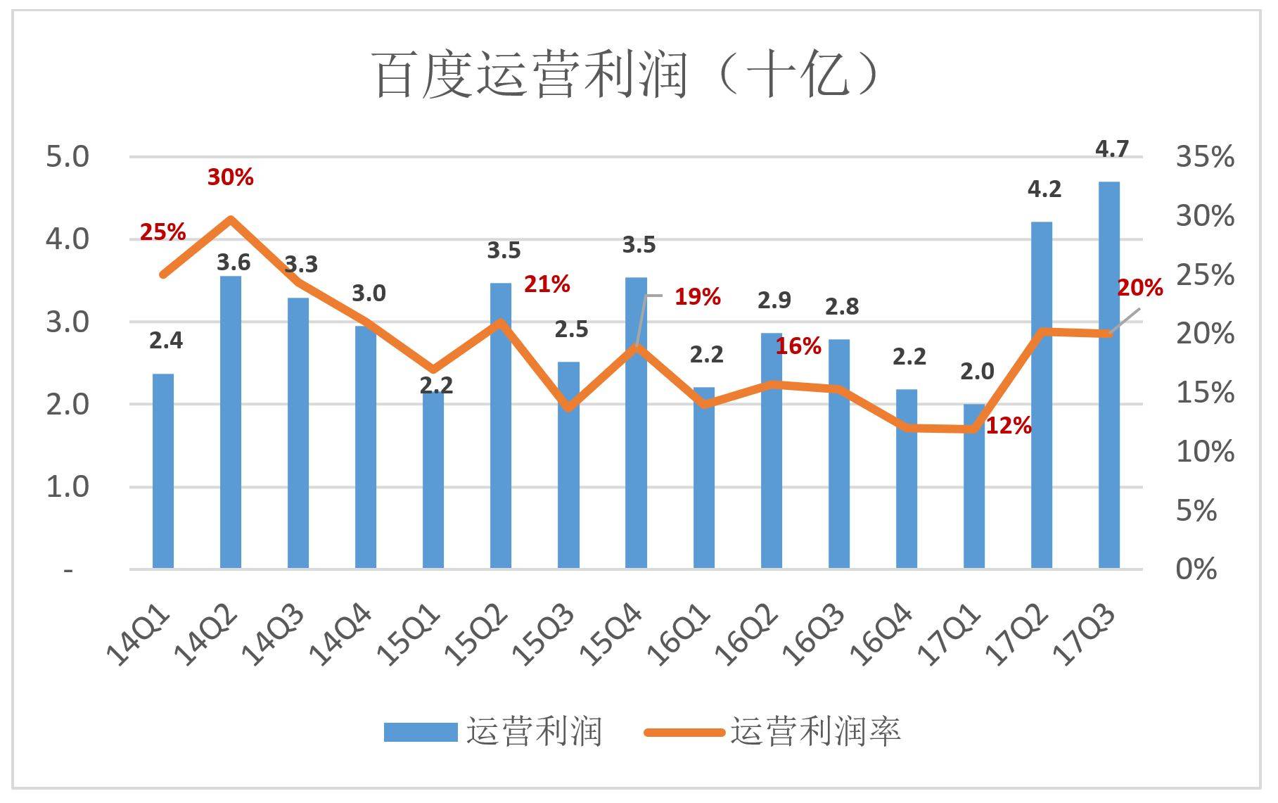 2017年Q3,百度运营利润达到创纪录的47亿,运营利润率恢复到20%一线。