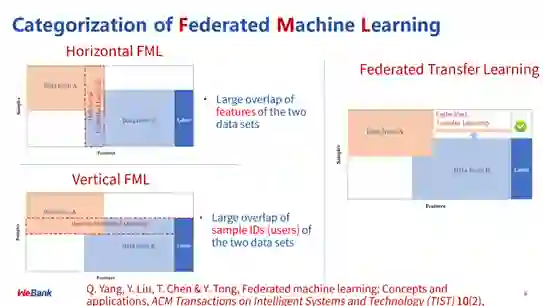 针对不同的数据样本类型,除了横向联邦学习,还有纵向联邦学习和联邦迁移学习两种不同的方式。