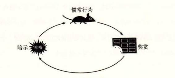 老鼠接收到暗示(听到咔哒声),就会激活基底核记录的惯常行为(按照特定的路线穿越迷宫),最后获得的奖赏(食物)会强化这一习惯。