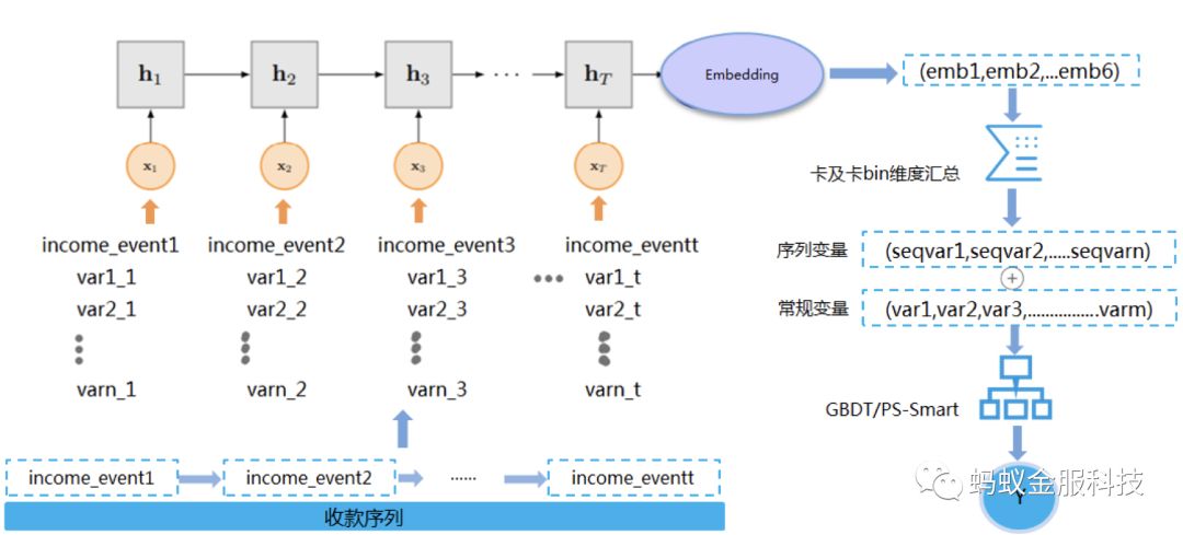如前面已提到转账到卡场景欺诈的防控难点在于新卡的防控。根据历史经验群体变量及FTG变量对于新卡有一定的防控效果,目前在转账到卡场景已刻画城市、年龄及卡bin等维度的FTG变量。为了进一步防控新卡风险,我们从群体及FTG变量的思路出发,利用深度学习序列建模生成卡维度的embedding,然后将卡维度的embedding再汇总到卡bin维度,汇总的embedding提炼了该卡bin的行为信息,从而对于新卡来说只要其卡bin出现过就可以获取其卡bin行为特征。最后将生成的embedding变量与现有变量合并建模,输出整体欺诈风险分值,具体流程图如下: