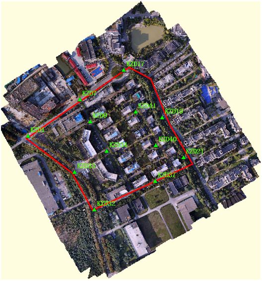 本次测试范围有效面积约0.1km²,共布设控制点12个,使用检查点36个,测试区域范围(红色范围线)及像控点分布如下:
