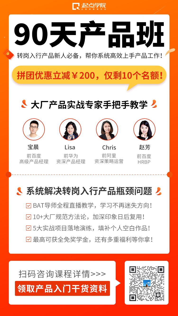 为了帮助这些0基础的产品新人,能更好地掌握产品理论知识体系,同时能更规范地输出产品相关文档、收获能让用人单位认可的产品实战经验,在此真诚向你们推荐这门由BAT资深产品导师带领新人入门的【90天产品经理实战班】课程。