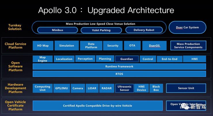 2 大新平台则是 Apollo 3.0 更新中非常重要的部分,包括此前的硬件参考平台升级为现在的硬件开发平台;此前的车辆参考平台升级为现在的车辆认证平台。