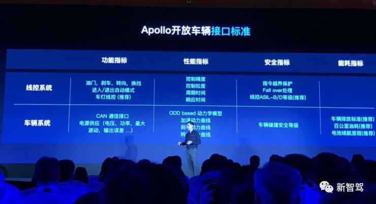 Apollo 3.0 将此前的车辆参考平台升级为车辆认证平台,这块将率先和比亚迪进行紧密合作,向自动驾驶开发者开放车辆接口标准,包括功能、性能、安全和能耗指标等,当然线控系统以及车辆系统的指标也在其列。