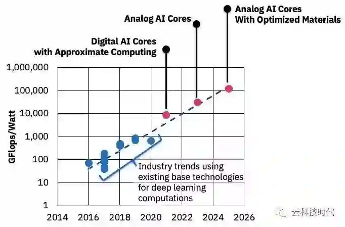 IBM研究院AI硬件中心主要推动IBM和生态伙伴们,在IBM的数字AI内核(Digital AI Cores)以及基于内存计算的模拟AI内核(Analog AI Cores)等技术基础上,展开“千里大跃进”。IBM认为,基于现有技术的深度学习计算能在2020年左右达到1000GFlops/W的计算能力;基于数字AI内核技术的深度学习计算能在2021年左右达到接近1万GFlops/W的计算能力,也就是十倍能力的提升;而基于模拟AI内核技术的深度学习计算能在2023年左右达到接近5万GFlops/W的计算能力,结合了优化的材料后则能在2025年左右推进深度学习计算达到10万GFlops/W的计算能力,并进一步在2030年左右达到100万GFlops/W的计算能力,也就是今天计算能力的千倍提升。