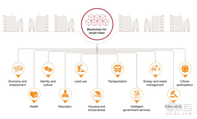 ▲区块链的智慧城市应用(经济与雇佣、健康、身份与文化、教育、土地使用、住宅、交通、智能政务、能源与浪费管理、公共安全、城市居民活跃性)