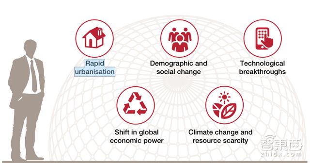 ▲五大全球发展趋势(快速的城市化、人口和社会变化、技术突破、全球经济力量转移、气候变化和资源匮乏)