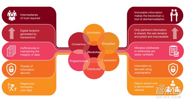 下图描绘了区块链技术如何解决当今信息相关交易的问题(左侧的框表示关键问题,如信托中介、交易数据印记、维护数据完整的效率、信息安全、数据垄断;右侧的框表示区块链解决方案,如去中心化、信息共享与部分加密、错误可审查、密码学保证数据安全、数据存储在民主网络)。