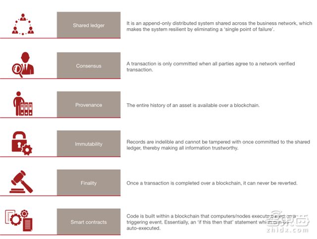 ▲区块链的六大特征(共享分类帐、共识机制、可溯源、不可篡改、交易完成不可恢复、智慧合约)