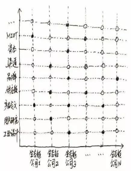 在生态链打造的初期,小米采用的是一种矩阵管理方式。纵轴是每一位工程师,每个人都有自己的专长,横轴则是企业或是产品。工程师的横线会穿过每一个生态链企业,形成一个平台角色。也就是说,负责市场的工程师就要负责所有企业的市场运作。但是这个层面中,他们与每个企业的交叉处是一个虚圈,同时他们每个人也会以产品经理的角色专门负责几个企业,这几个企业与相对应的工程师的交叉处就是实圈了。一开始小米用这样矩阵式的管理,保证所有人都有产品经理的角色,也有平台负责人的角色,这样既可以做到集体决策,又可以快速高效地解决现实中遇到的问题。