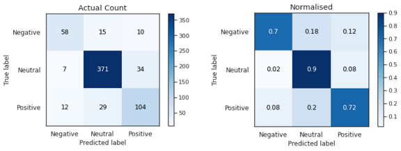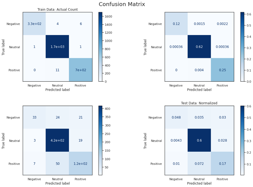 我将为后者写另一篇文章,所以这里关注前者的数据。这是一个包含更正式的金融领域特定语言的文本示例,我使用了Malo等人的FinancialPhraseBank(https://www.researchgate.net/publication/251231107_Good_Debt_or_Bad_Debt_Detecting_Semantic_Orientations_in_Economic_Texts)包括4845篇由16人手写的标题文本,并提供同意等级。我使用了75%的同意等级和3448个文本作为训练数据。