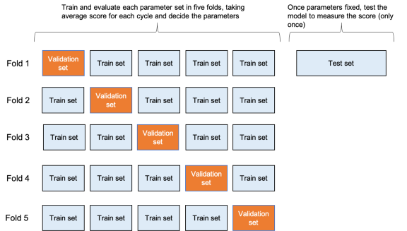 首先,输入数据以8:2分为训练组和测试集。测试集保持不变,直到所有参数都固定下来,并且每个模型只使用一次。由于数据集不用于计算交叉集,因此验证集不用于计算。此外,为了克服数据集不平衡和数据集较小的问题,采用分层K-Fold交叉验证进行超参数整定。