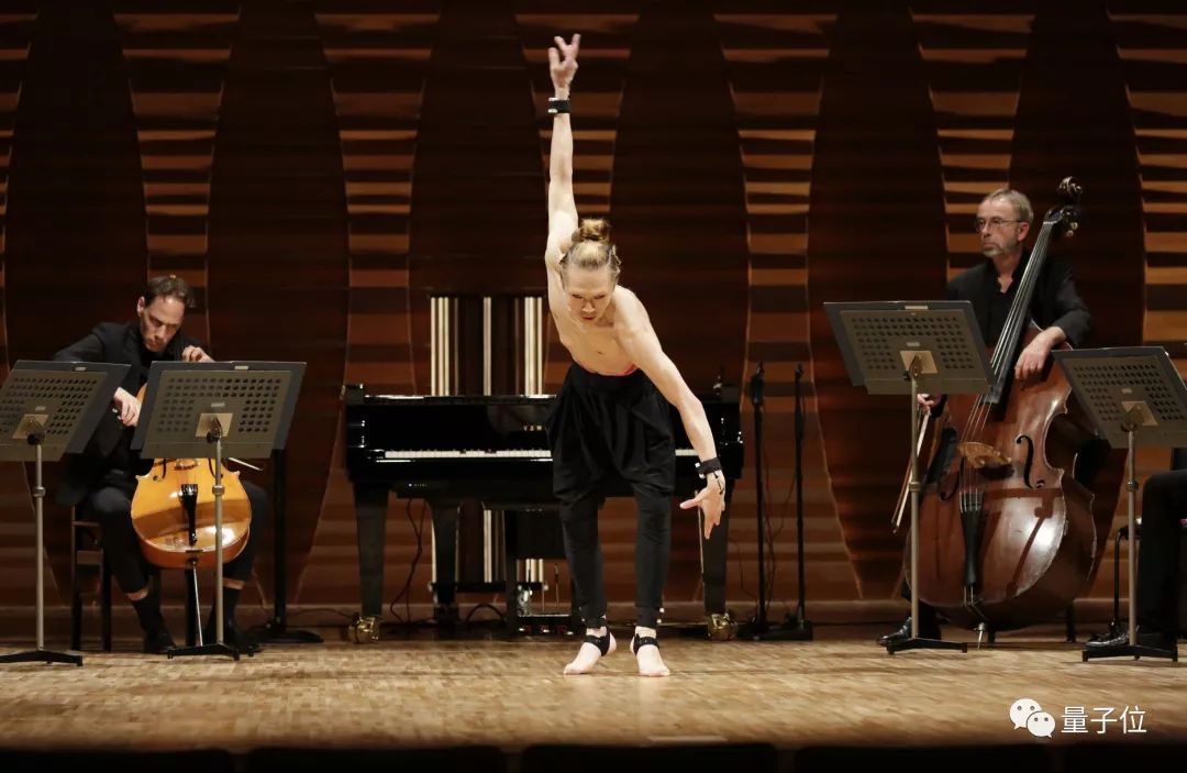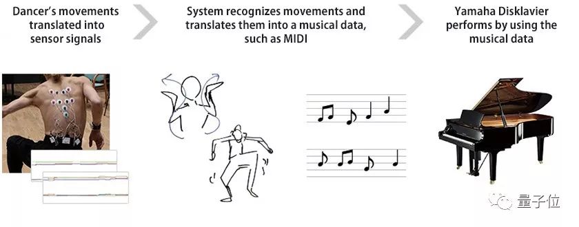 通过舞蹈家身上穿戴的传感器,可以实时捕捉到舞蹈家的动作姿态。结合AI系统已有的姿态对应旋律的数据库,可以把动作即时输出旋律数据。然后再把旋律数据传送给雅马哈的Disklavier钢琴,演奏出动耳的音乐。