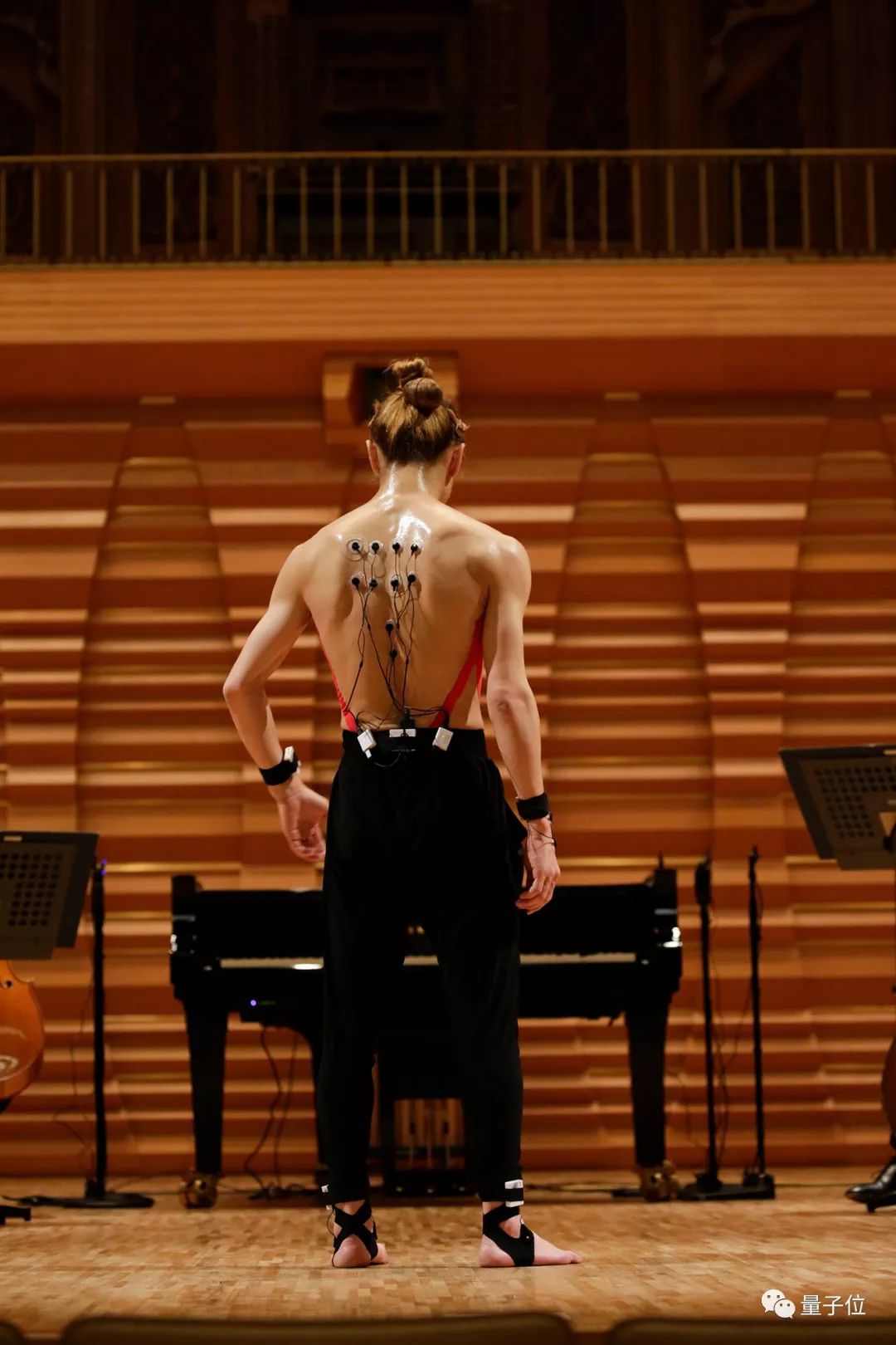 这次演出使用了雅马哈的AI系统。舞蹈家森山开次的背部、手腕和脚上一共装了四种传感器。当他跳舞时,舞蹈动作可以被实时地转换成乐曲数据。