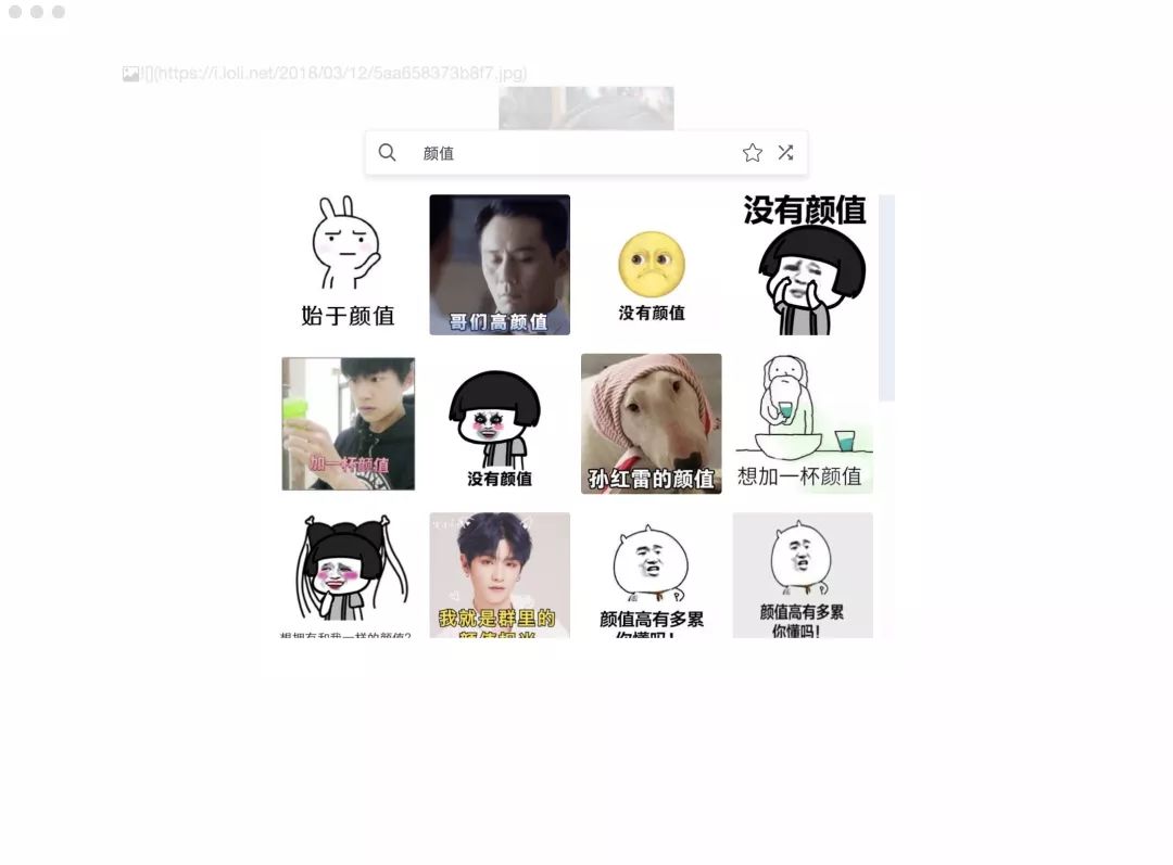 Mark Text 还有一个有趣的地方,它内置有斗图功能,为你省掉「斗图」的烦恼,只需通过快捷键 Cmd+/ 直接打开斗图搜索面板,就可找到有趣的图片。