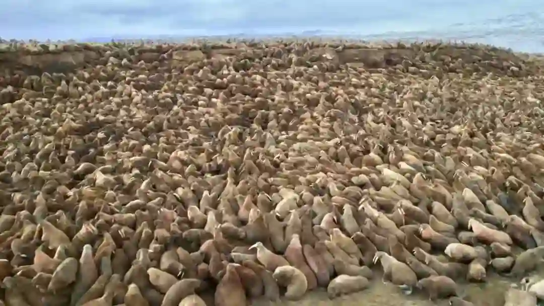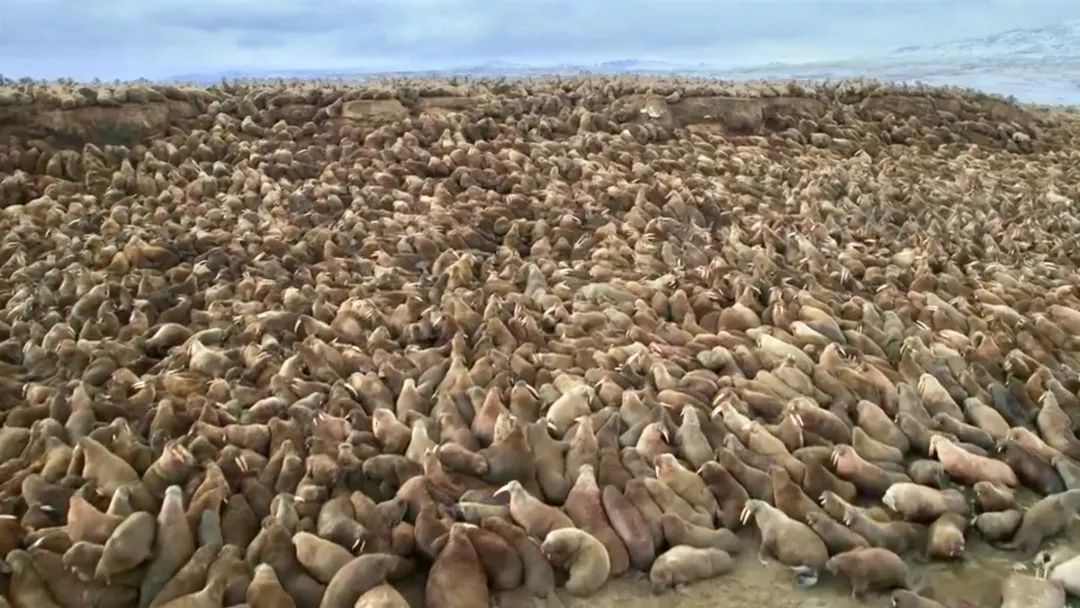 然而,近些年,北冰洋的冰一直在变薄、变少。当浮冰逐渐减少时,越来越多的海象们被迫前往海边的陆地栖息。