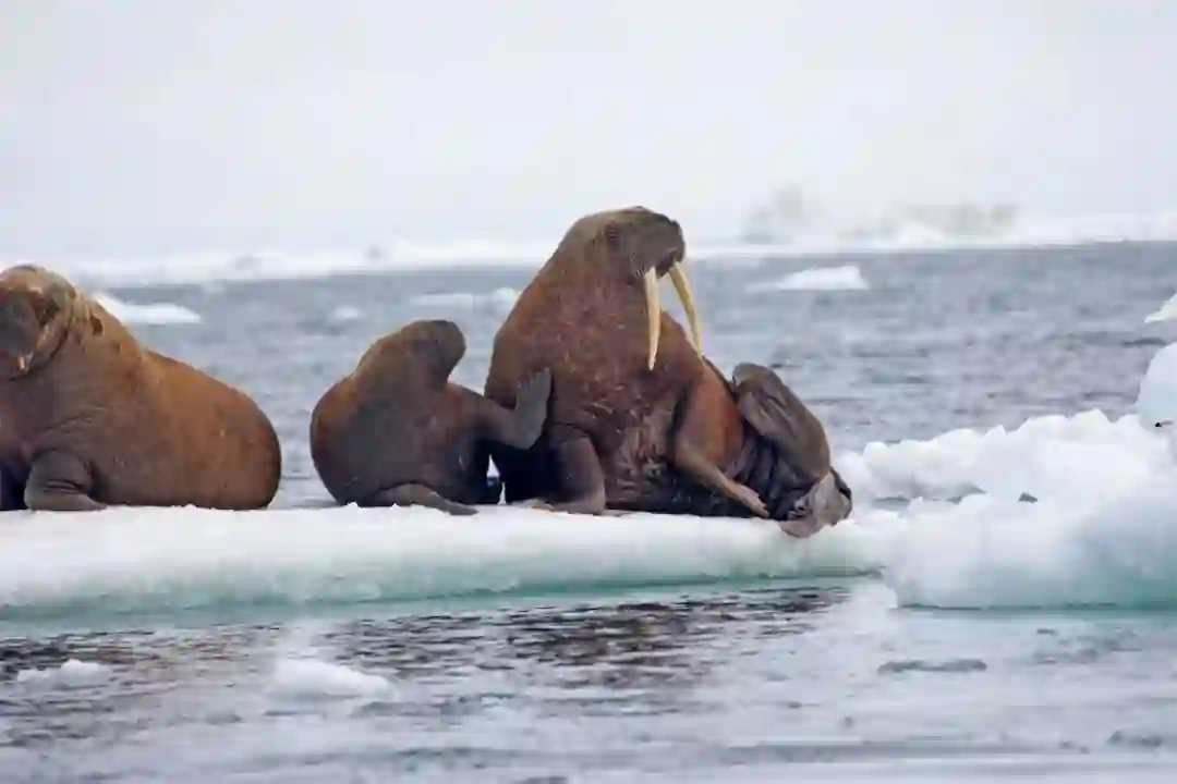 海象群通常以性别划分,雌性、雄性有自己的群体。在夏天,海滩上的栖息地一般是由雄性海象组成的,有时候也会有雌性、小海象,因为它们在海上找不到合适的浮冰。雌性海象可以重达1吨多,因此,浮冰必须足够厚才能支撑它们。而海象宝宝虽然一出生就可以游泳,但在前三年,它都跟在妈妈身边。