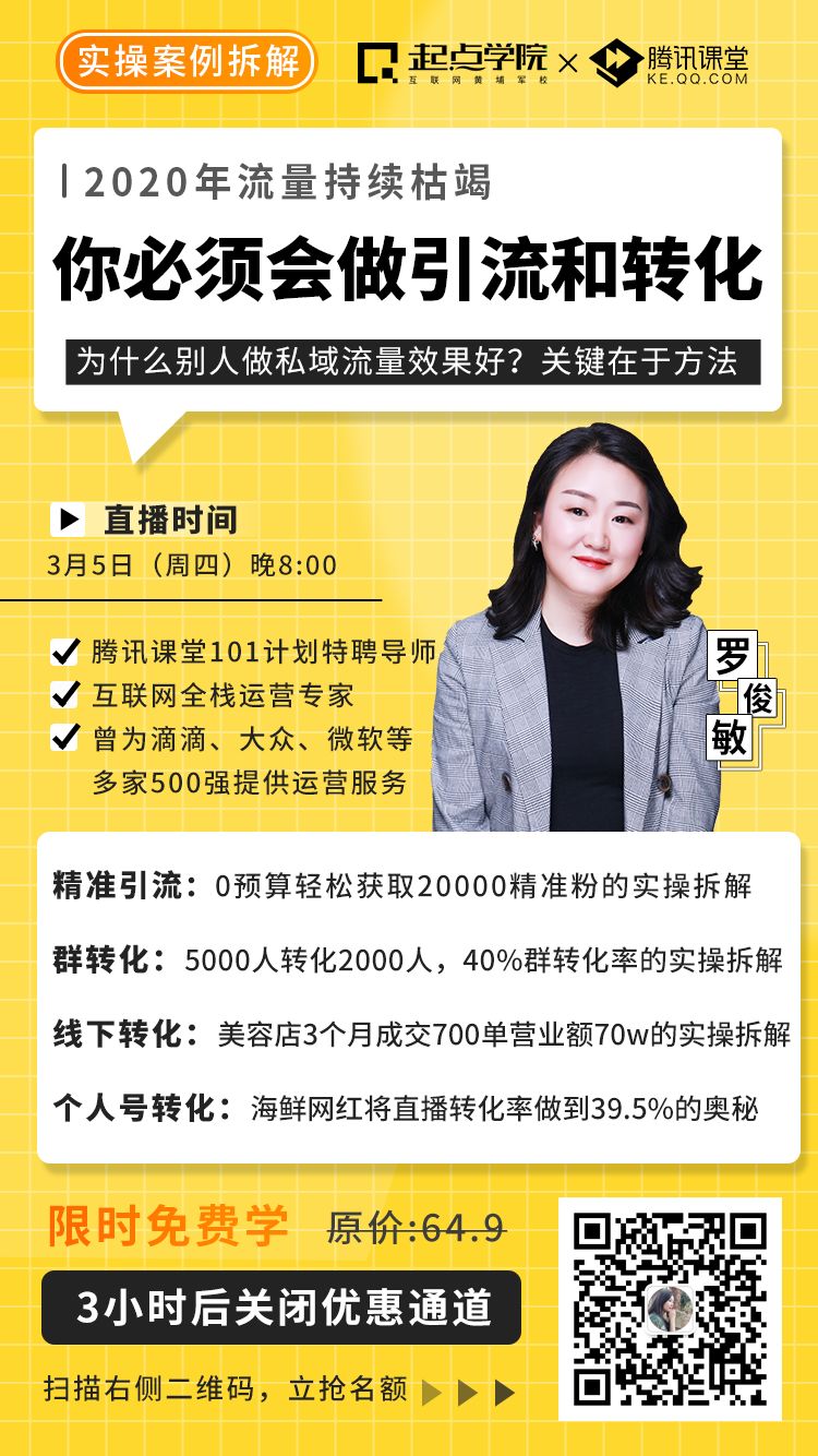 这里给大家推荐一个免费的引流和转化公开课,授课导师将拆解自己的操盘案例,分享引流和转化方法,希望能启发你的思维,对你有所帮助。