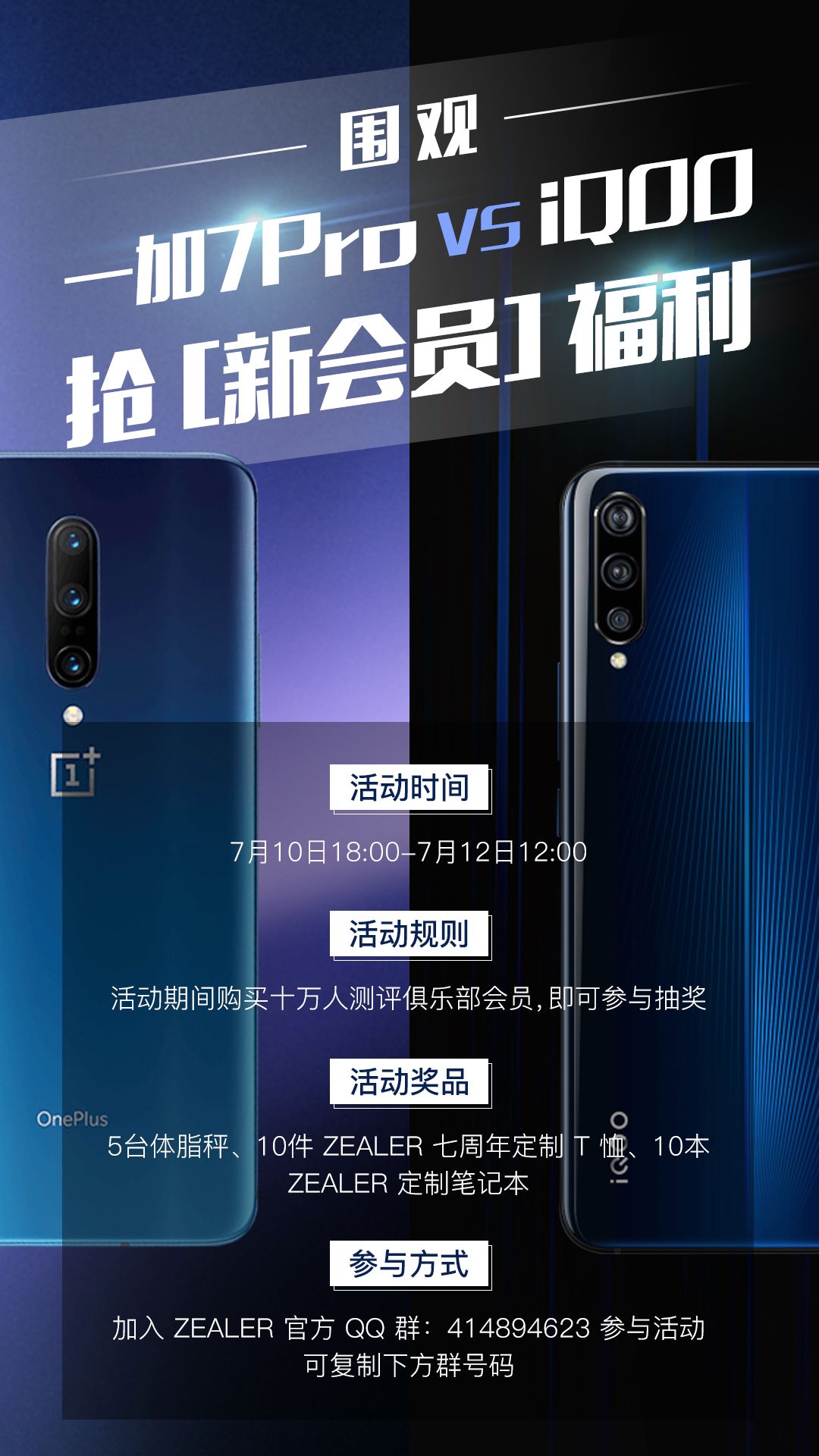 这场较量,将决定谁将进入八强,无论是屏幕还是相机,以及电池,都有值得聊聊的地方,SPY 机皇争霸赛第十期一加 7 Pro VS iQOO 明晚上线,7 月 10 日 至 7 月 12 日 加入会员即可参与抽奖,包括体脂秤(5 台)、ZEALER 七周年定制 T 恤(10 件)以及ZEALER 定制笔记本(10 本),还没加入的小伙伴赶紧行动起来吧!(活动官方 QQ 群: 414894623 )