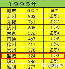 1995年,盐城GDP在江苏省内排名第8,为324亿元,第一名苏州903亿元,差不多是盐城的3倍。