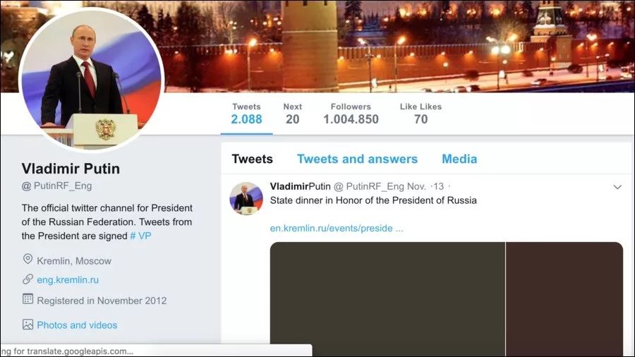 俄罗斯领导人的官方推特由@KremlinRussia_E和@KremlinRussia两个账号运营
