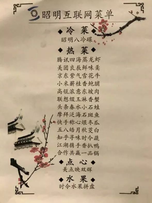 这菜谱,腾讯系的名字都在里面了,最后还颇有寓意地说“合作共赢一品锅”
