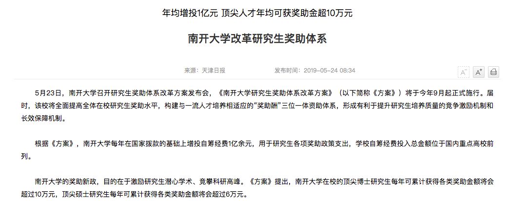 尽管从 2017 年秋开始,博士研究生的国家助学金上调为 15000 元每年,但从这个角度看,南开大学的《方案》依然大方得让学生们眉开眼笑。