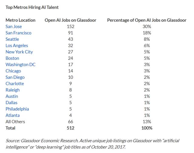 在 Glassdoor 上列出的所有 AI 工作中,有 67%位于圣何塞、旧金山、西雅图、洛杉矶和纽约市。