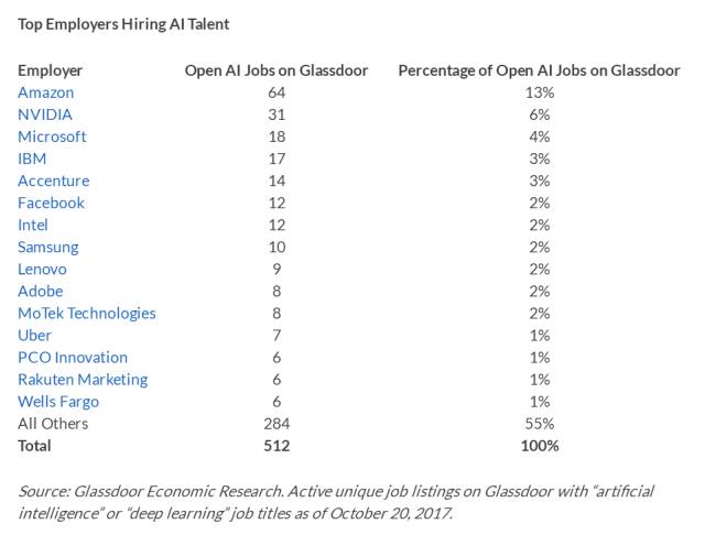 以上这些见解都来自 Glassdoor Research 的一项研究“Who's Hiring AI Talent in America?”(https://www.glassdoor.com/research/studies/ai-jobs/),作者是 Glassdoor 首席经济学家 Andrew Chamberlain 博士。作为一家为职场人士提供企业点评和职位搜索的社区网站,Glassdoor 发布了 2018 年最佳雇主排行榜,为接下来想在人工智能领域找工作的人才提供了参考价值。