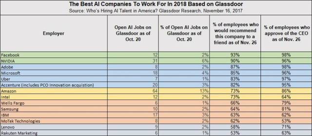 Facebook、NVIDIA、Adobe、微软、Uber 和埃森哲是 2018 年最佳的五家人工智能公司。在 Glassdoor 网站上,这五家公司就已经公布了 96 个新的 AI 职位,占到网站总发布职位的 18.7%。