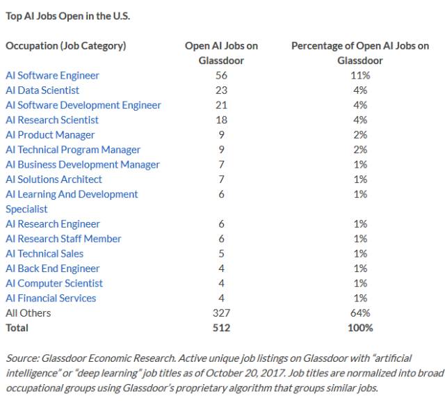 3. 截止 10 月 20 日,Glassdoor 上有 512 个 AI 相关职位,其中 AI 软件工程师、AI 数据科学家、AI 软件开发工程师和 AI 研究科学家共有 118 个职位。