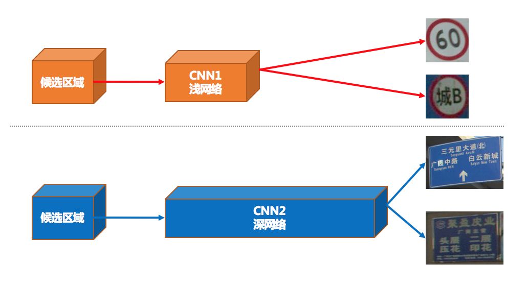 如下图,针对圆形标牌,其差异比较明确,可以使用简单网络;针对方牌,需要根据文字布局和内容来区分正负样本,分类难度大,因此必须使用较深的网络: