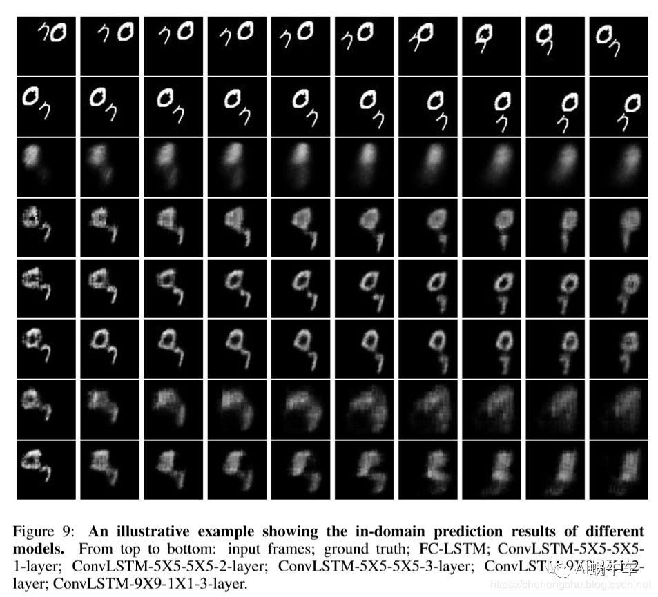 最上面十个为输入序列,下面为输出序列,在下面都是各种模型所预测的对比结果。在这个数据集上,可以看到为什么叫时空序列问题,因为有数字的运动信息和本身数字的像素结构信息,还有序列的前后推移和联系,所以也是时空序列问题。