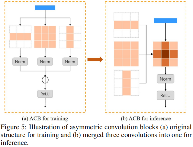 最后的最后,作者还提供了算法的推理耗时优化(竞赛要求推理耗时不超过50ms,而前述模型肯定是超过了)。首先,进行ACB的合并,下图给出了ACB的合并示意图;然后,进行Conv与BatchNorm的合并;最后,采用torch2rt工具将Pytorch模型转为TensorRT加速。