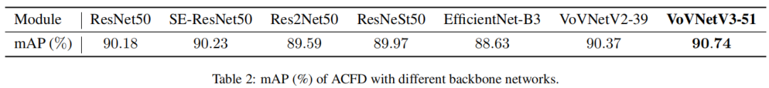 首先,给出了不同骨干网络下的模型性能对比,见下表。所提方法VoVNetV3-51取得了最佳得分。