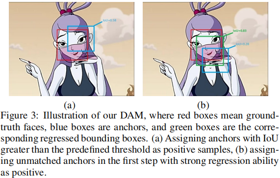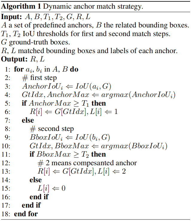 受上述现象启发,作者提出一种DAM策略以充分利用这些具有强回归能力的锚点,从而更好的为每个GT人脸匹配充足的高质量锚点。首先,IoU得分大于阈值的锚点被设置为正;然后,如果对应回归框的IoU得分大于阈值将被补偿为正。算法细节如下,挺有意思的一种处理策略。