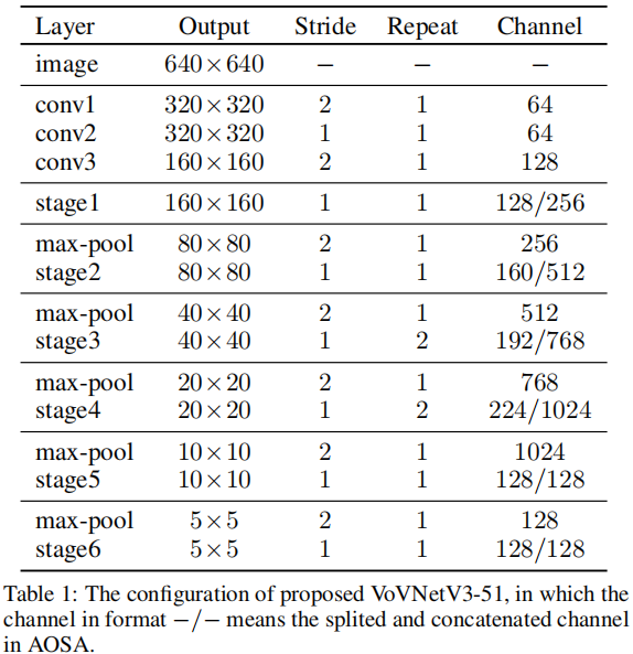 作者采用所提AOSA模块构建VoVNetV3-51骨干网络,网络结构信息见下表。