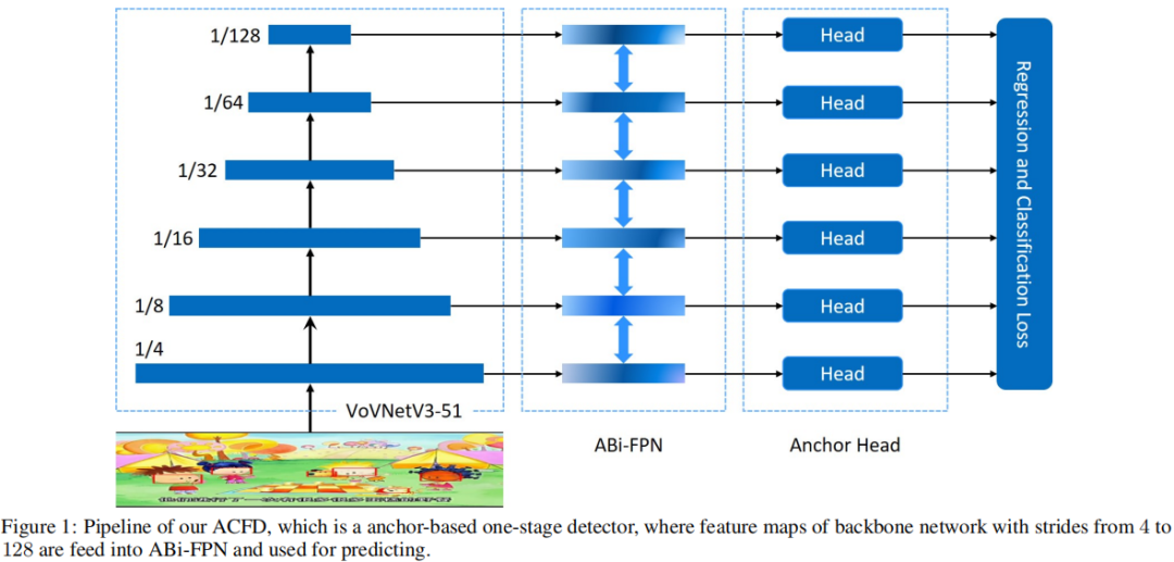 下图给出了所提ACFD的网络架构图,它采用VoVNetV3-51作为骨干网络(包含6个阶段生stride=4到128的特征),然后采用ABi-FPN进行多尺度特征融合与增强,最后采用锚点Head网络输出稠密预测。