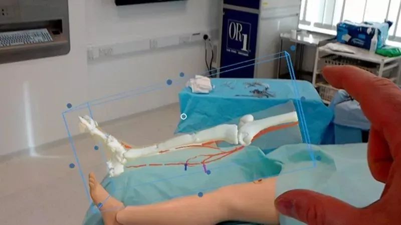 通过HoloLens眼镜,将腿部CT扫描图像中的骨骼和关键血管的位置准确地覆盖在病人的腿上,可以让外科医生在手术中能够“透视”手术部位。