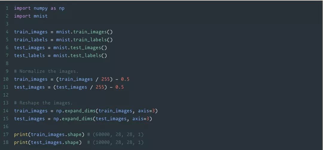 在开始之前,我们将把图像像素值从 [0,255] 规范化为 [-0.5,0.5] 以使网络更容易训练(使用较小的中心值通常会得到更好的结果)。我们还将把每个图像从(28,28)改为(28,28,1),因为 Keras 需要第三维度。